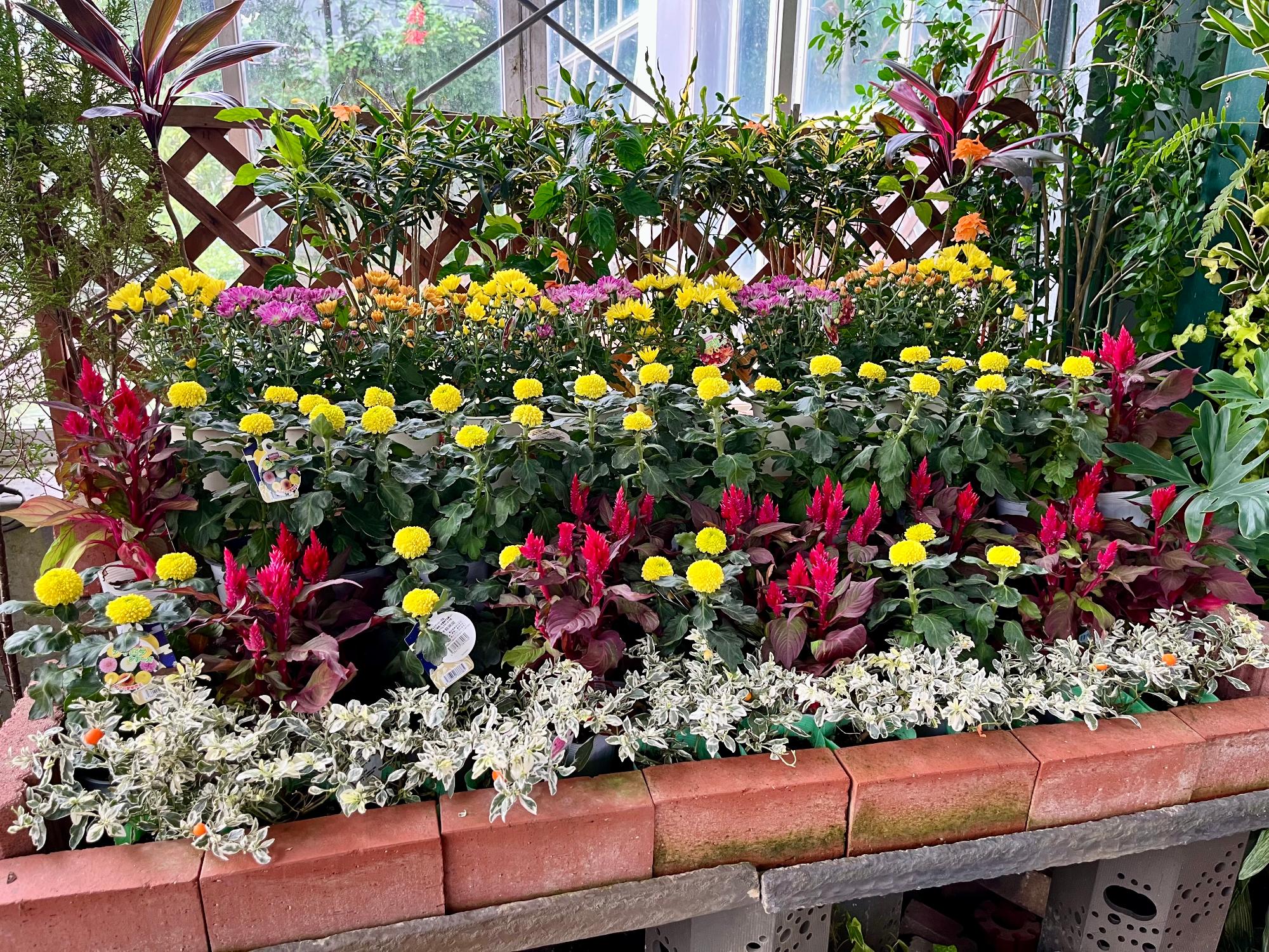 鉢植え向きに矯正園芸種として育成された洋菊をポットマム、その中でも1茎からスプレー状に多数花を咲かせるものをスプレーマム、まんまるとボリュームのあるシルエットをしているのがガーデンマムです。まだ一部しか咲いていませんが、これから開花を迎え、温室を菊たちが華やかに彩っていく様子をゆっくり見守ってみてはいかがでしょうか。