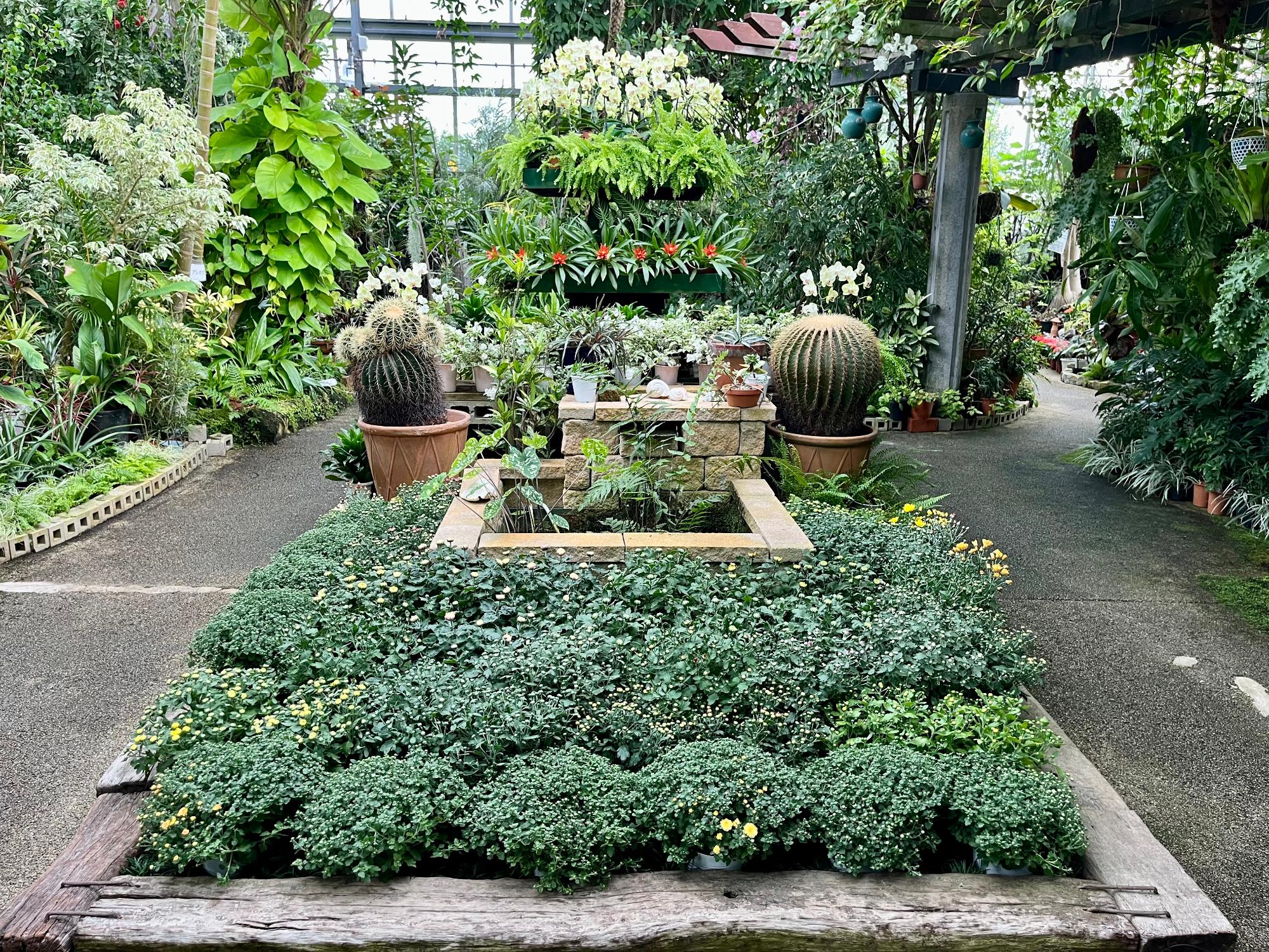 温室一の見どころである温室中央のタワー前には、開花前のポットマム、スプレーマム、ガーデンマムが並んでいます。