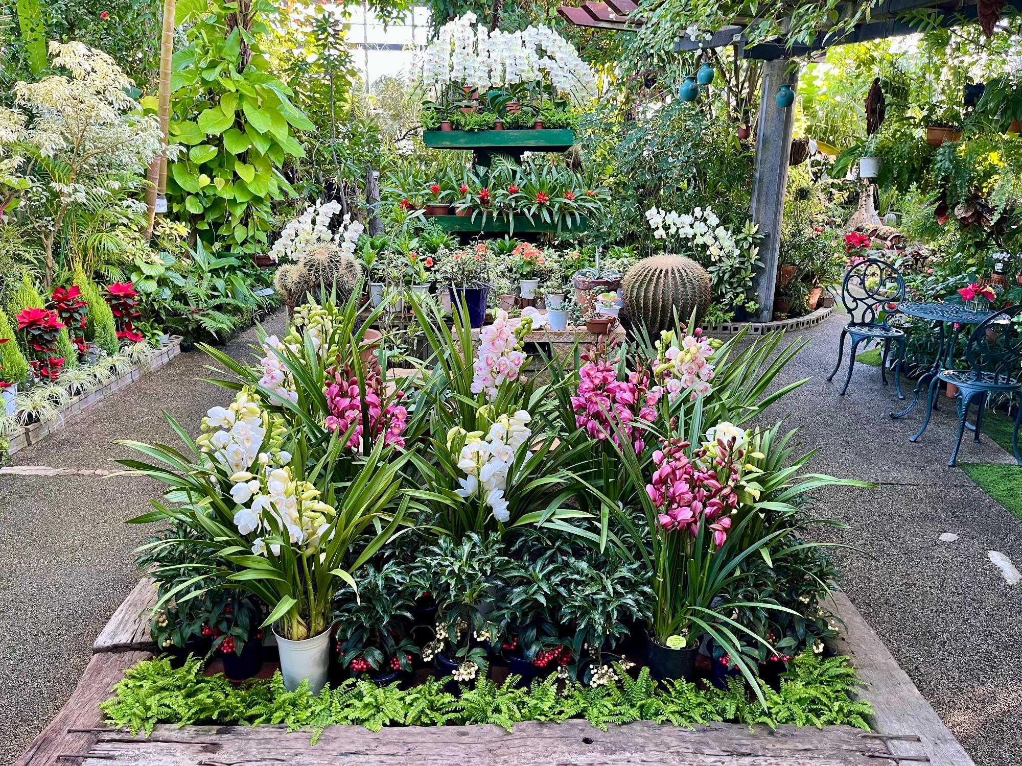 温室一の見どころである温室中央のタワー前には、大きな花と葉を携えた、白や紫色のシンビジュームと、その足元には白や赤の実をぶら下げているマンリョウが並んでいます。