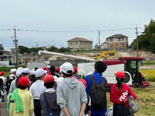稲刈り体験を終え、コンバインで一気に田んぼの稲を刈り取る様子を見学すると作業の早さに驚きと歓声が沸き上がりました。