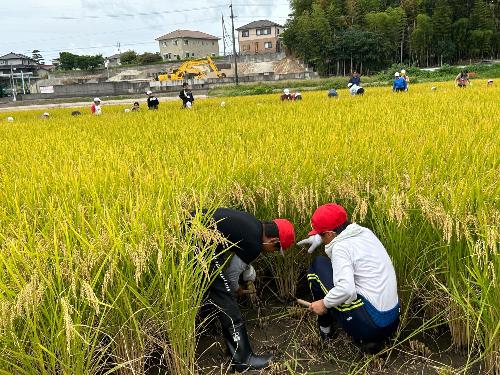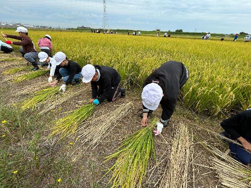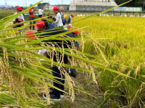 令和7年10月3日(金曜日)、地元農家とJAあいち中央の皆さんのご協力をいただき鷲塚小学校の5年生が北浦ふれあい体験農園にて稲刈りの体験学習を行いました。