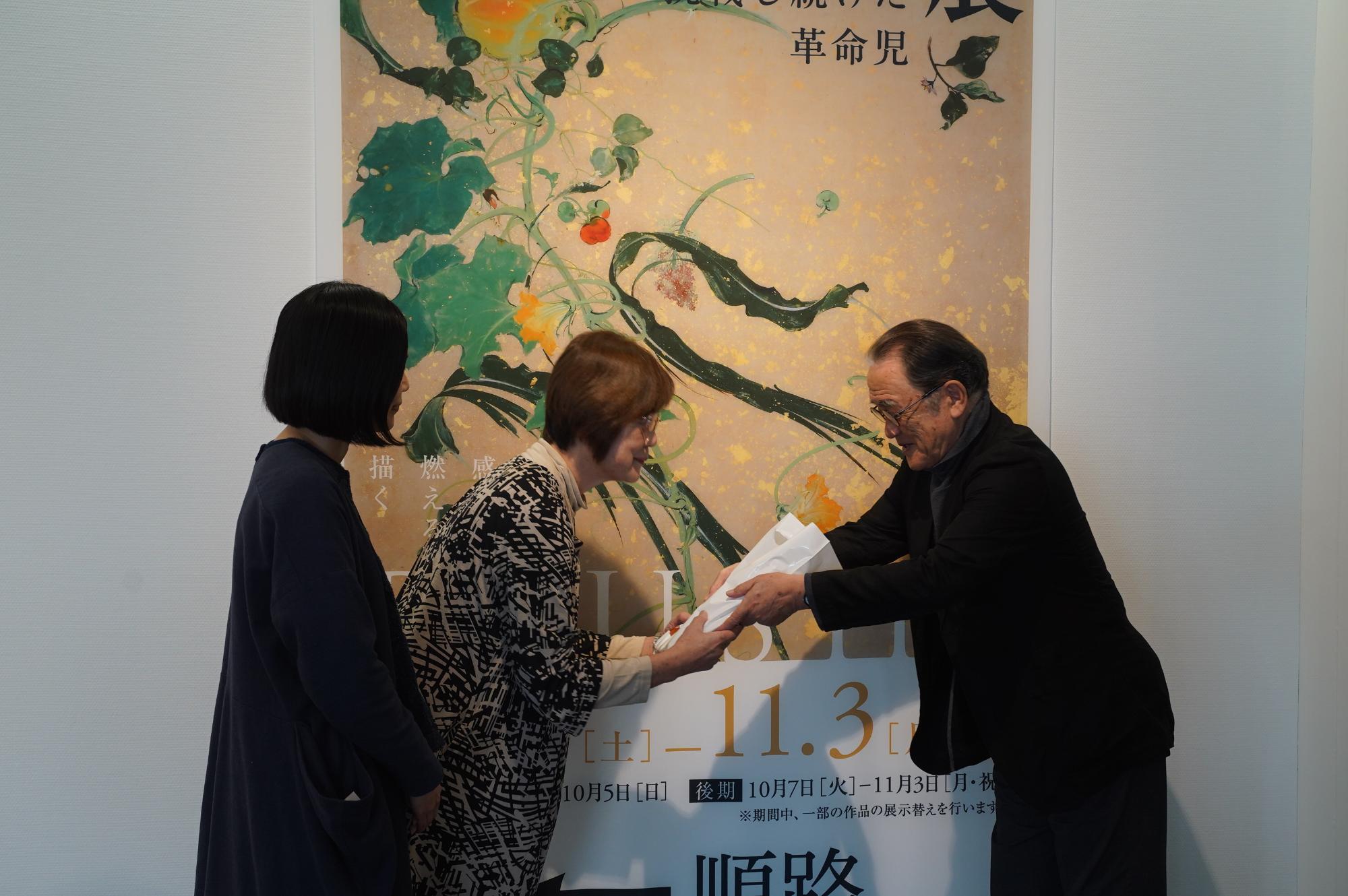 記念品として観覧者1万人目認定書、記念品「扇面流し」複製陶板、図録「川端龍子展 日本画壇に挑戦し続けた革命児」、次回企画展「吉岡弘昭展 哀しみとおかしみを湛えた不思議な魅力」招待券が贈呈されました。