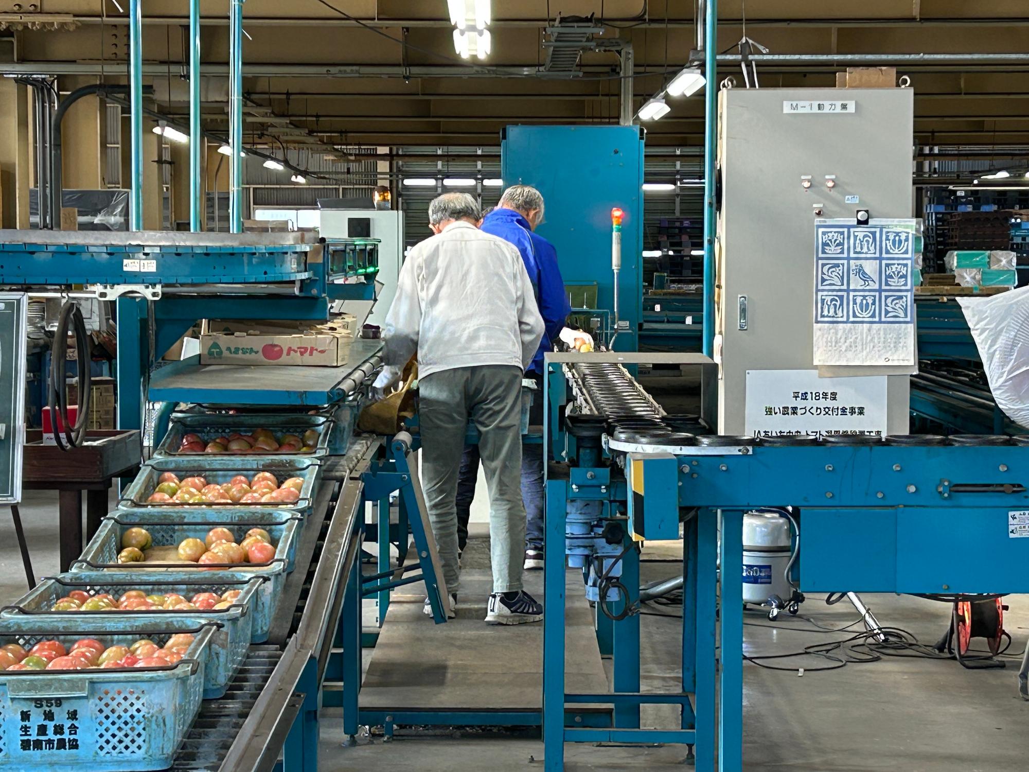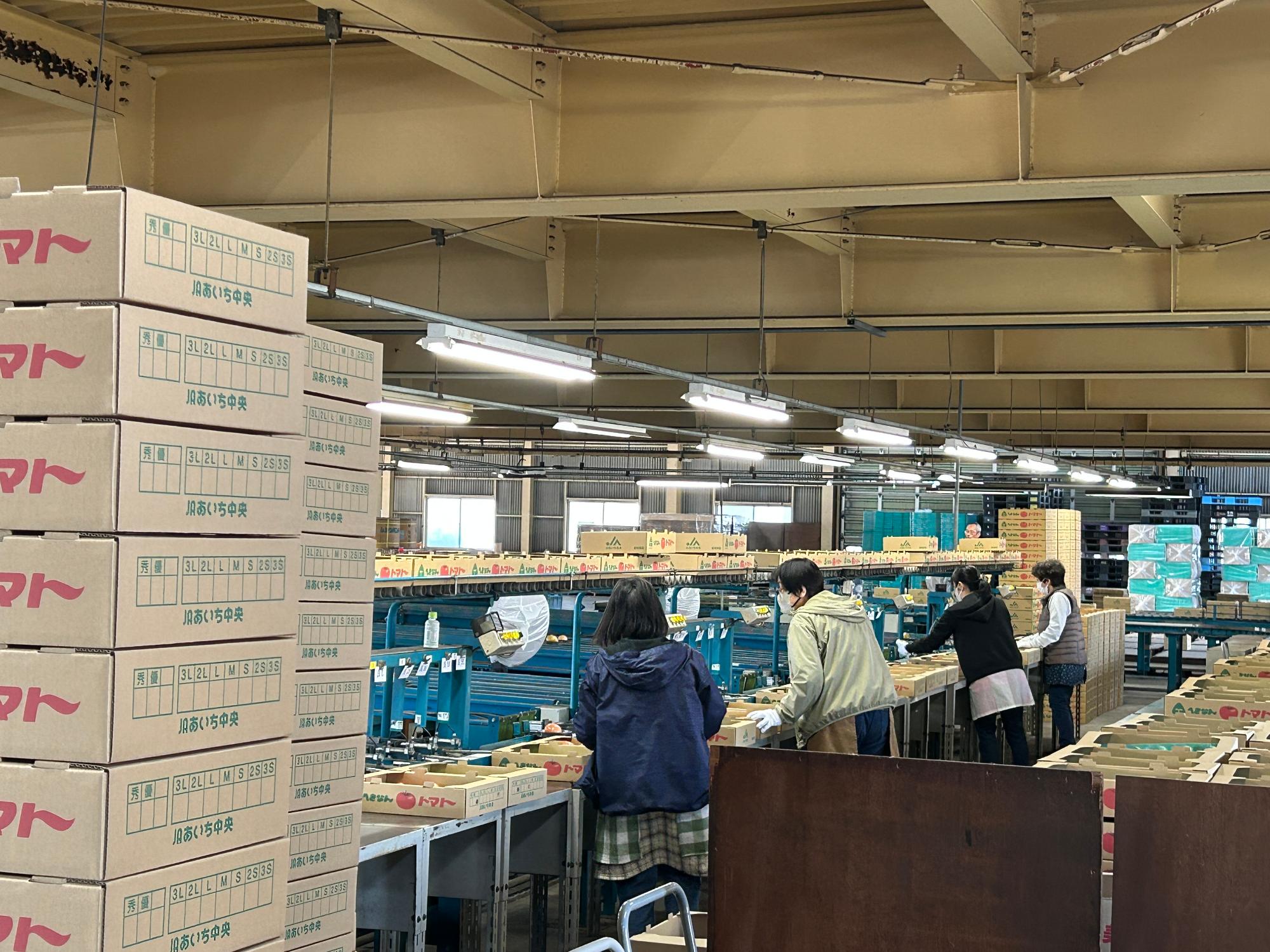 収穫したトマトは選果場にて人の目で傷の有無や色味を確認し、機械で形状を確認した後、人の手で箱詰めして出荷されます。