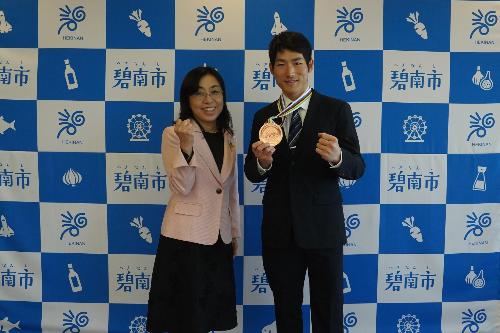 市長は、「コンディションが悪い中での銅メダル獲得、本当におめでとうございます。川本選手の頑張りは私たちの励みにもなります。これからもケガをせずに、自分のためにも、応援してくださる人々のためにも頑張ってください。」とエールを送りました。