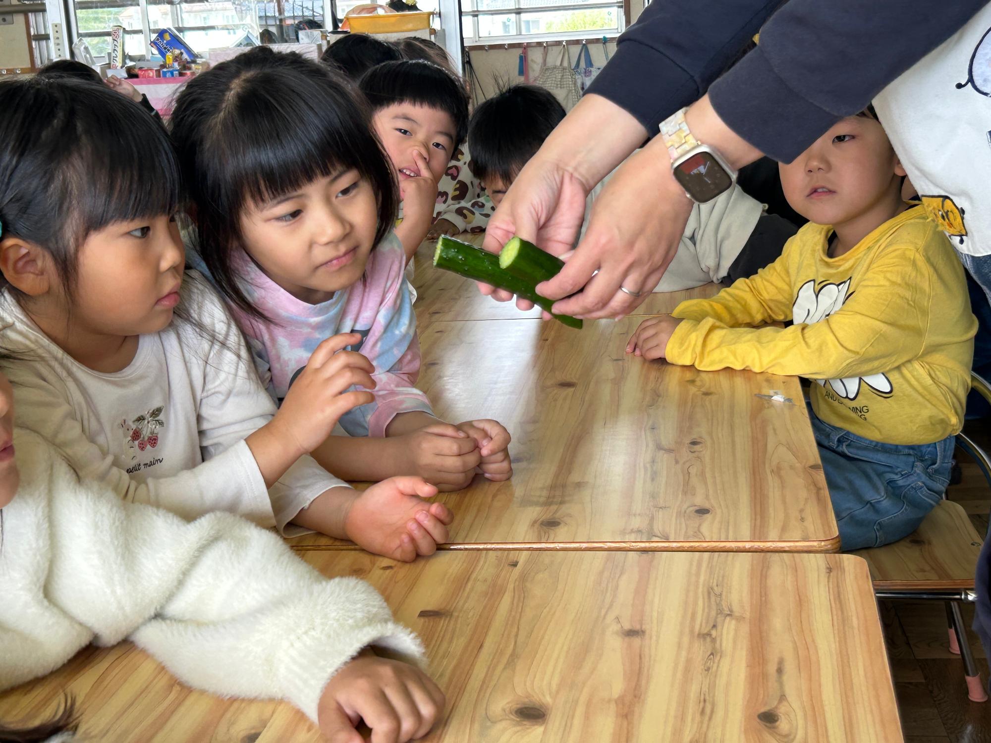 園児たちは、きゅうりの色や形、匂いに触れながら、「曲がってる!」「笛みたい!」と大発見。切ってみると外側と内側の違いにもびっくり!