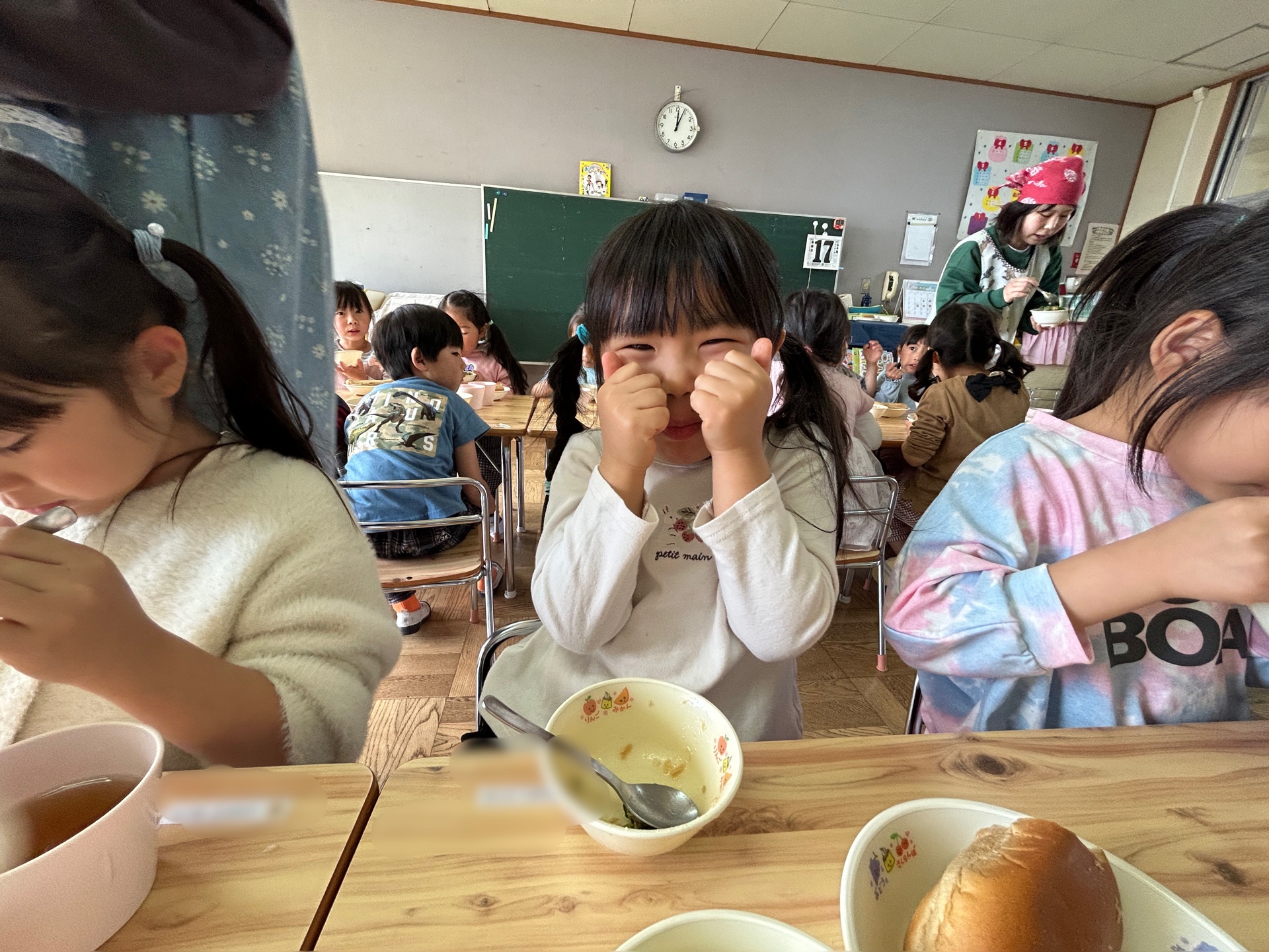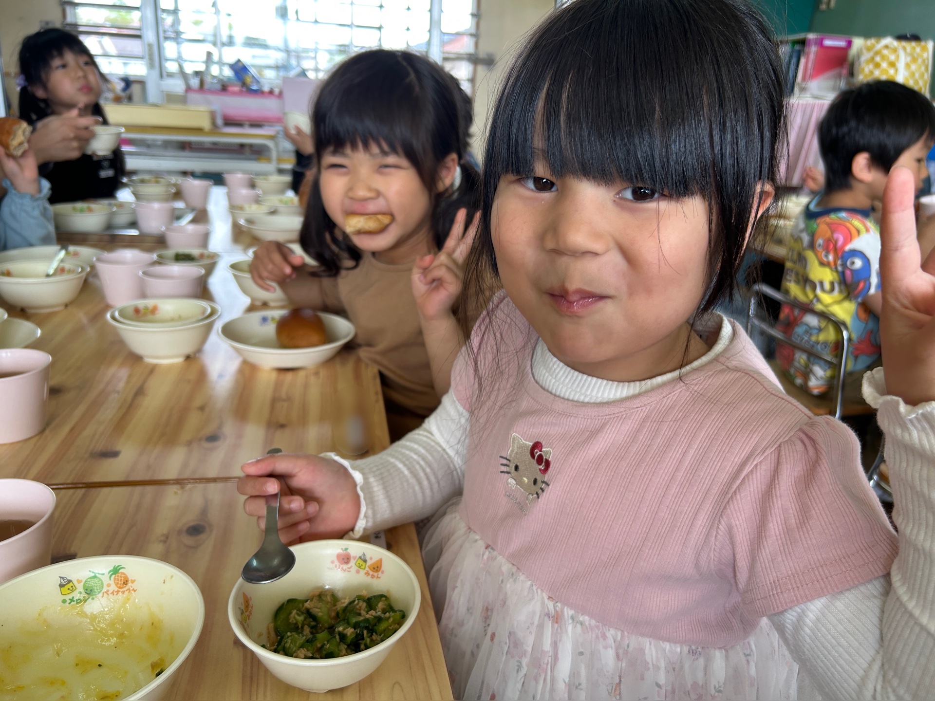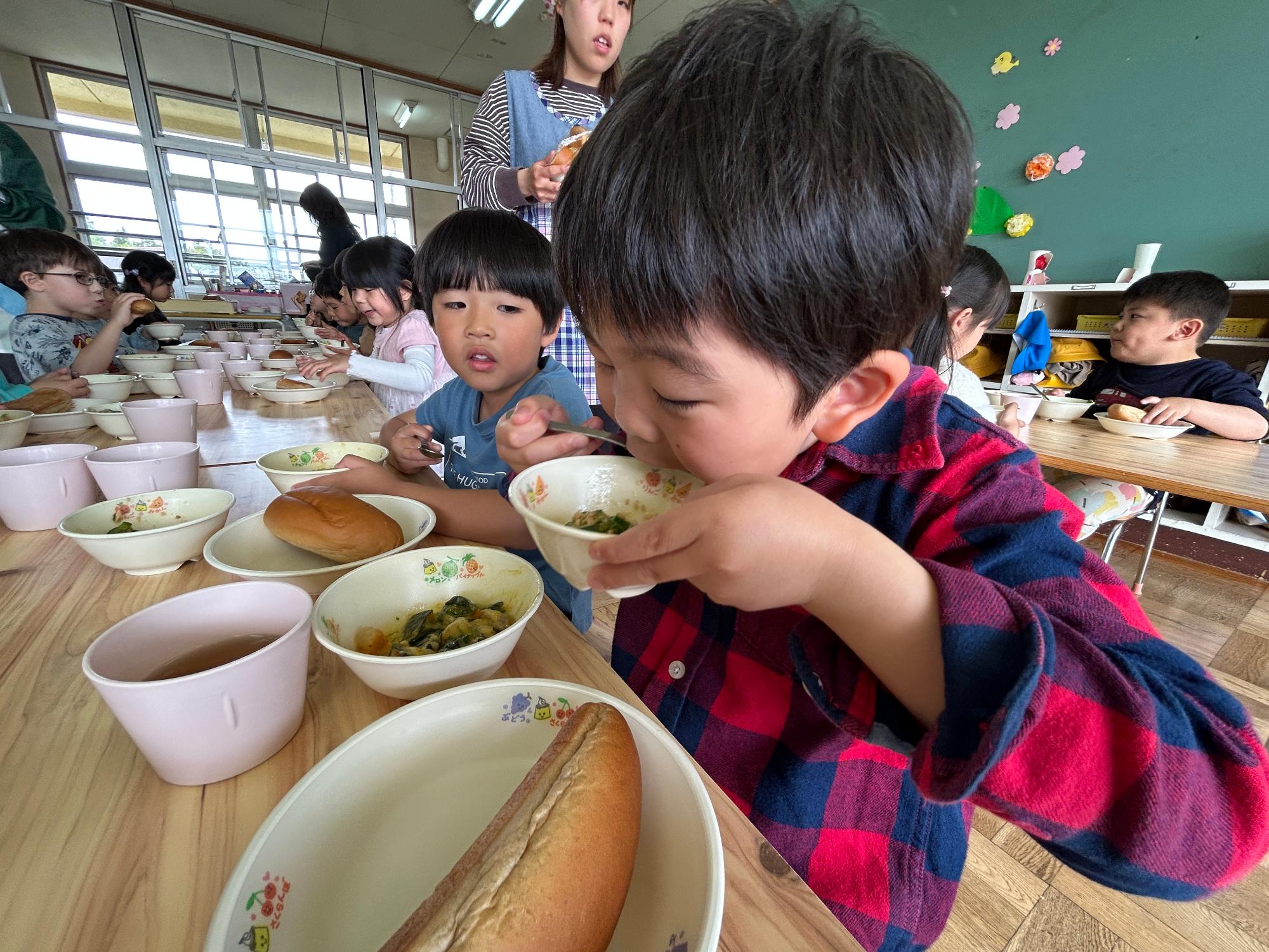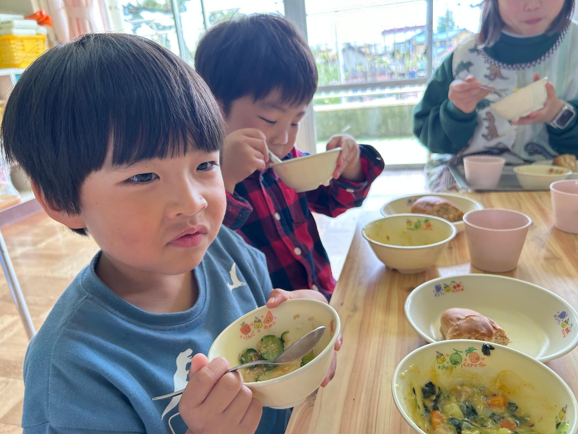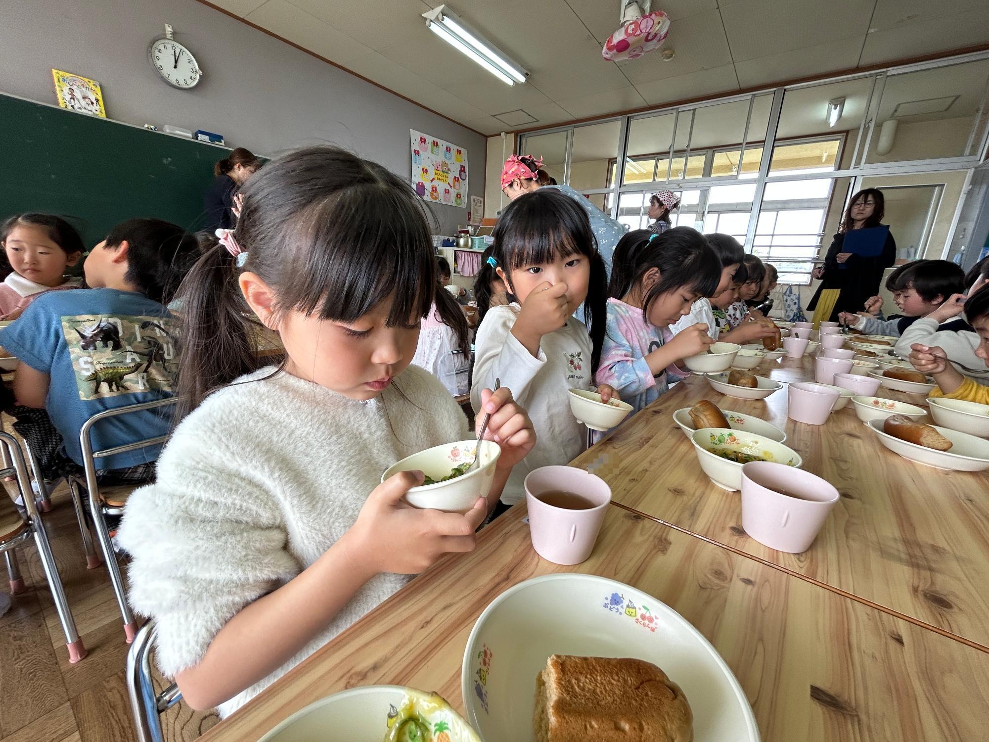その後、「三河みどり」を使った給食では、パンやシンデレラシチュー、きゅうりとツナの中華和えを美味しそうにパクリ!