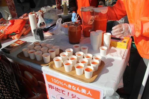 今回は、初めて試飲・試飲でのPRを行いました。試飲では事前にカットしたへきなん美人をジューサーで搾った「へきなん美人生搾りジュース」を、試食ではジューサーで搾ったあとのニンジンの搾りかすを、ツナとマヨネーズで和えた物をクラッカーに乗せた「へきなん美人のツナマヨ和え」を振舞いました。