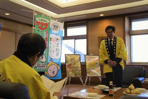部会長の小澤利英さんは「今年は秋の高温で生産がとても大変でしたが、良質なタマネギができています。」と市長にPRしました。市長は、「碧南といえばニンジンのイメージが強いが、タマネギのイメージもぐんぐんあがっている。ブランド化も進んできているので、市としても協力して盛り上げていきたい。」と話しました。