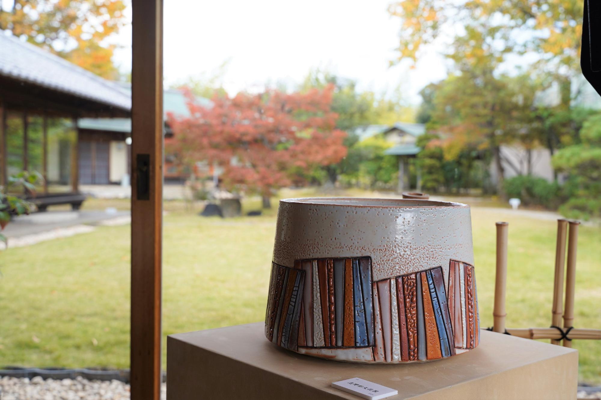 研修道場「安吾館」にも作品が展示されています。作品をご覧いただきながら、お抹茶とお菓子、日本庭園の紅葉をお楽しみください!