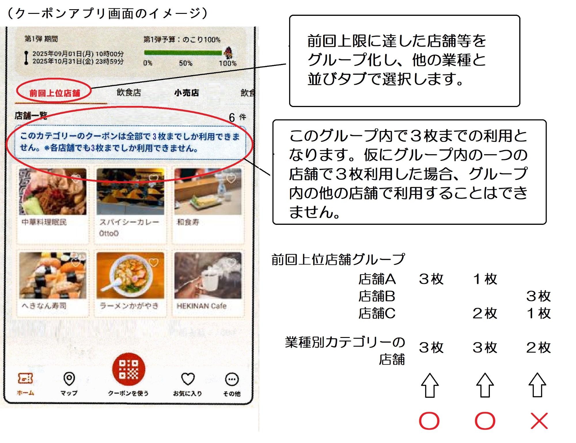 ただし、前回実施した際に、店舗上限に到達した店舗などは一つのグループとしてまとめ、グループ内で合計3枚までのご利用となります。