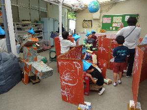 みんなで作ったサファリパーク。「かばバスに乗れますよ」と、お客さんを乗せて園内を探検です。