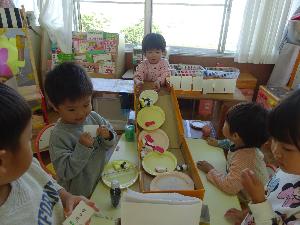 5月から給食が始まりました。小さな手でフォークを持ち、食べ物を口へ運びます。みんなで食べるとおいしいね。
