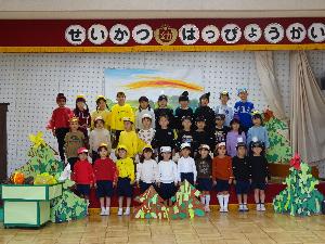 4・5歳児合同誕生会です。お祝いの演技は大好きなエビカニクスの体操です。「カニはピタって止るんだよ」