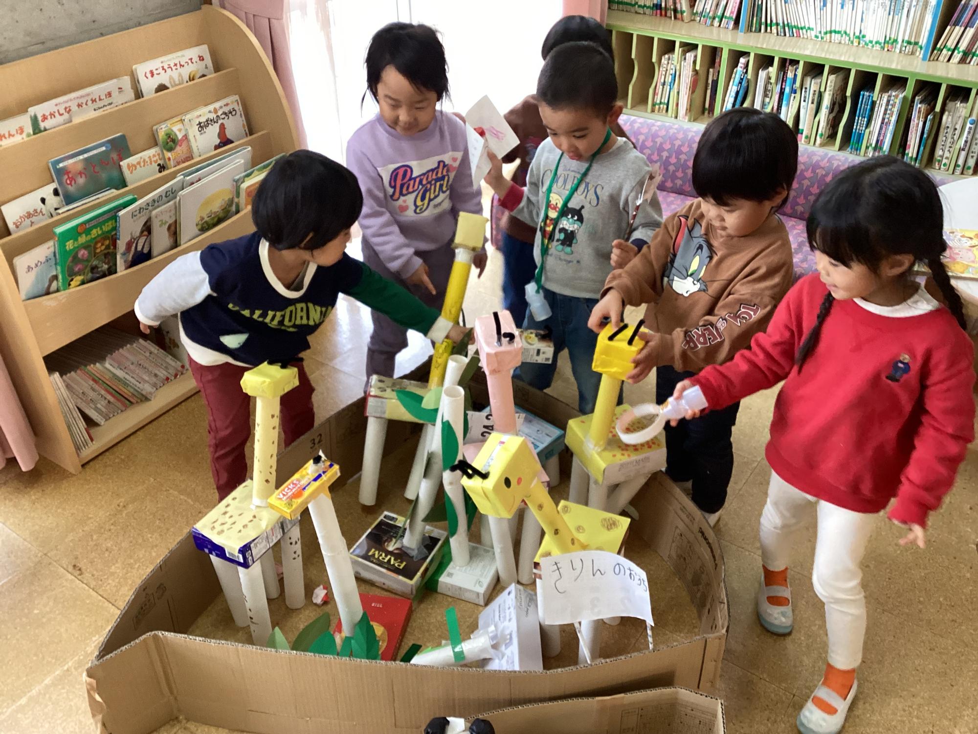 空き箱でいろいろな動物を作ったよ。動物園に行ってキリンを見たり、エサをあげたりしています。