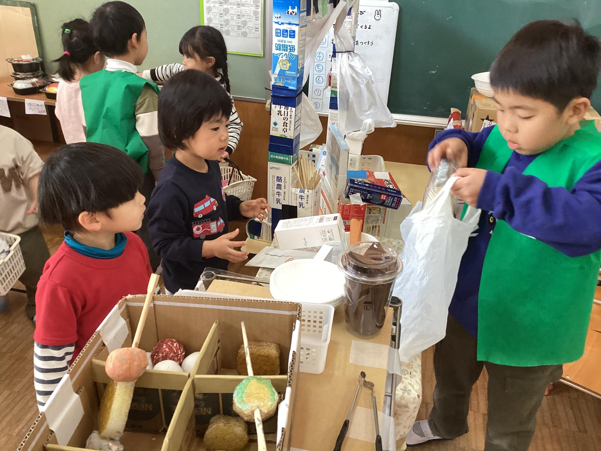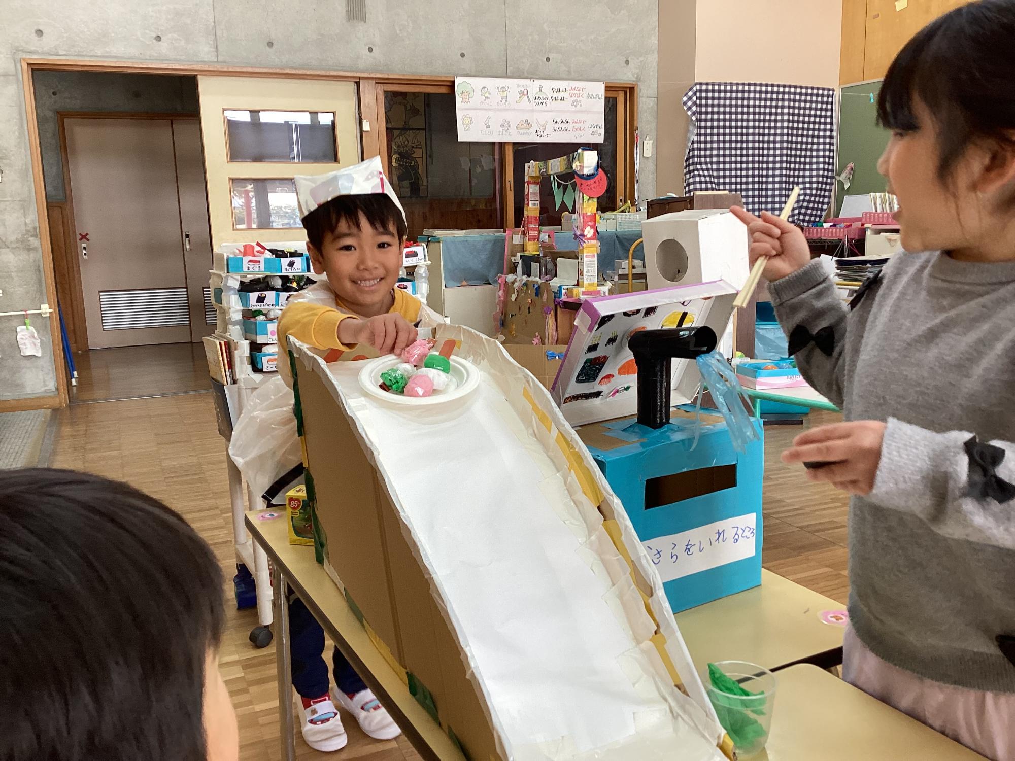 お祭りに行った経験から、みんなで意見を出し合って、いろいろなお店が出来上がりました。