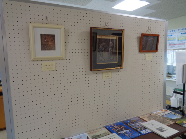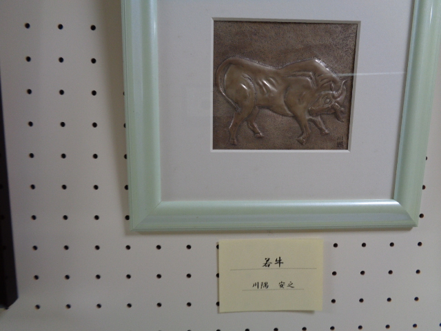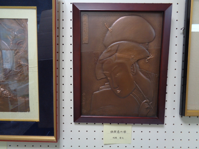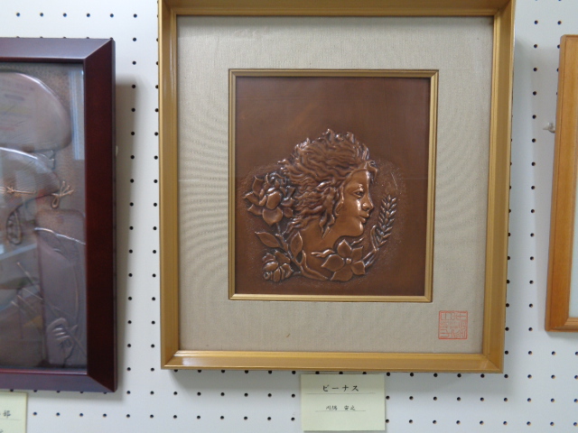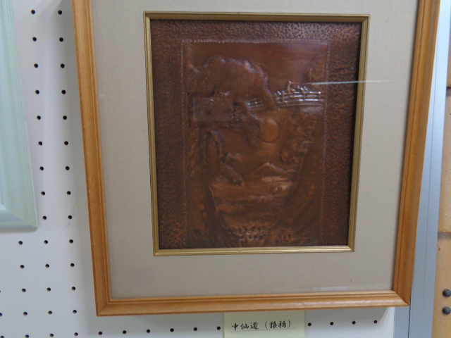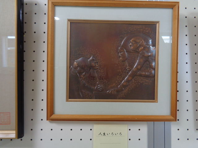 令和7年12月をもって26年間のサークル活動を終えた「SAIK会(さいくかい)」の作品展示です。銅板に描いた下絵に絶妙な力加減で叩きながら凹凸(おうとつ)を入れ、着色したのち細かく磨いて作る芸術作品です。じっくり見ていると作者の熱意と長年培ってきた経験による熟成度を感じられる作品となります。