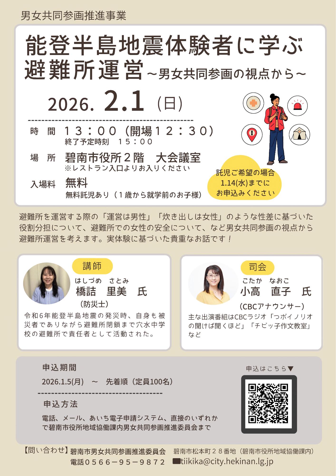 | 申し込み方法 | 令和8年1月5日(月曜日)9時より、碧南市地域協働課窓口、電話、メールまたはあいち電子申請システムにて事前申し込み(先着順、定員100名) |